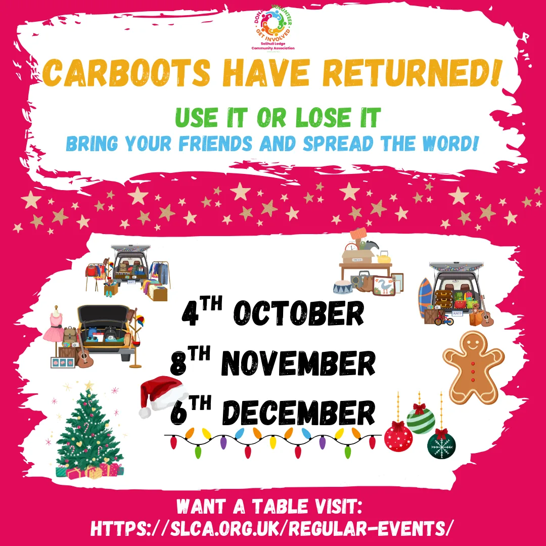 Table Top Sales 8th November – Indoor Carboot: https://buytickets.at/solihulllodgecommunitycentre/1843916