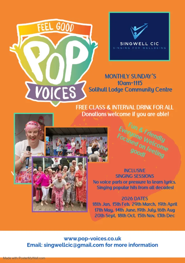 Join us at Solihull Lodge Community Centre once a month for a dose of musical sunshine! We are thrilled to host Feel Good Voices, a relaxed and uplifting singing group powered by the award-winning Pop Voices.
