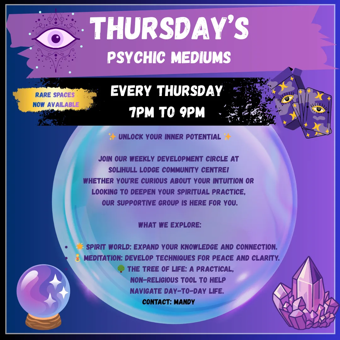 Are you looking for a safe, supportive space to explore your intuitive gifts and deepen your spiritual understanding? Join us every Thursday at Solihull Lodge Community Centre for our Psychic and Mediumship Development Circle.
